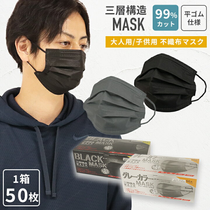 「PEIV」が「マスク 不織布 カラー 50枚 立体 3層構造 カットフィルター 3層式フィルター 99%使用 大人用 ふつうサイズ ブラック グレー 黒 灰色 使い捨てマスク 平ゴム 送料無料」を販売