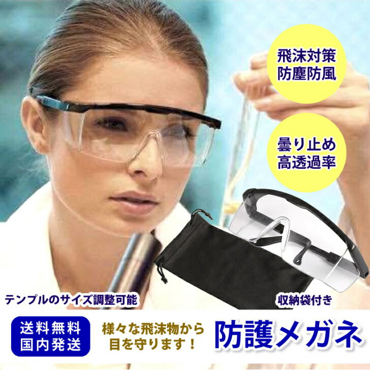 商品情報商品説明〇フィット感抜群の防護メガネ・アイシールドです〇飛沫・花粉・防塵・防風対策、サバイバルゲームにも〇曇り止め仕様ですので、マスクの上から着用しても曇りにくいです〇テンプルは長さ調整が可能(110〜130mm)〇便利な収納袋付き〇重さ:約30g〇国内発送。翌営業日に定形外郵便での発送となります。※消毒・洗浄方法曇り止めコートは非常に柔らかいコーティングとなっております。乾拭きや強い力での拭取りはコーティングを傷める恐れがございますのでご注意ください。消毒につきましては、洗剤(界面活性剤)、もしくは次亜塩素酸水でやさしく洗ってください。台所用洗剤の場合は水で薄めてご使用ください。水道水でよくすすいだ後、やわらかい毛の立たない布で押し当てるように水分を吸収してください。防護メガネ アイシールド 飛沫対策 医療 曇り止め 曇りにくい ウイルス対策 飛沫防止 花粉症対策 防風 サバゲー サバイバルゲーム 飛沫・花粉防止に大活躍! 5