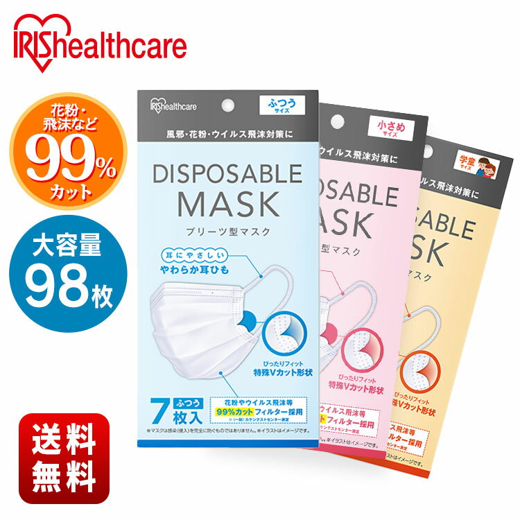 花粉・飛沫等を99%カットするフィルターを採用しています。側面両端Vカット加工しているので、ほほとのすき間を低減し、長時間ぴったりフィットします。耳にやさしいやわらか丸耳ひも採用で耳が痛くなりにくいです。(耳ひも:丸ひも4mm)ダブルΩプリーツ加工で口元空間をキープするから会話が楽です。<学童サイズ>■内容量7枚入り×14個■商品サイズ(cm)幅約13.5×高さ約8■主要材質本体・フィルター:ポリプロピレン耳ひも:ポリウレタン、ポリエステルノーズフィッター:ポリエチレン<小さめサイズ>■内容量7枚入×14個■商品サイズ(cm)幅約14.5×高さ約9■主要材質本体・フィルター:ポリプロピレン耳ひも:ポリウレタン、ポリエステルノーズフィッター:ポリエチレン<ふつうサイズ>■内容量7枚入×14個■商品サイズ(cm)幅約16.5×高さ約9■主要材質本体・フィルター:ポリプロピレン耳ひも:ポリウレタン、ポリエステルノーズフィッター:ポリエチレン≪ご注文前のよくある質問についてご確認下さい≫