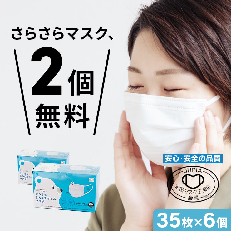 ※衛生用品の為、キャンセル・返品・交換は不可となっております。ご了承の上ご購入ください。 伸縮性のある素材の為、着用時に多少の誤差(伸びる)が生じる場合がございます。 ※ふわふわ うさちゃんマスクと比べると、大きく感じる場合があります。 商品名 Qurra さらさら しろくまちゃんマスク 35枚入り 製品特徴 ・さらさらで付け心地がよい、アイシングナイロン素材を採用 ・3層構造のフィルターで花粉・微小粒子・飛沫・ウイルスを99%カット ・遮断率の試験も行っているから安心 ・柔らかいソフト耳掛けで長時間つけていても痛くなりにくい ・個包装だから持ち運びにも便利 型番 3R-SRK01WT(普通サイズ:ホワイト) 3R-SRK01BK(普通サイズ:ブラック) 3R-SRK01KW(小さめサイズ) サイズ 〈3R-SRK01WT、3R-SRK01BK:普通サイズ/ホワイト、ブラック〉 マスク部 約17.5×9.5cm耳掛け 約16cm 〈3R-SRK01KW:小さめサイズ〉 マスク部 約14.5×9.5cm耳掛け 約16cm パッケージサイズ 〈3R-SRK01WT、3R-SRK01BK:普通サイズ/ホワイト、ブラック〉 約20.5×10.5×12.5cm 〈3R-SRK01KW:小さめサイズ〉 約17.5×10.5×12.5cm 入数 35枚(個包装) 対象 かぜ・花粉・ほこり等 素材 本体: 皮膚に接触面:ナイロン 外側:ポリプロピレン不織布 フィルター:ポリプロピレン不織布 ノーズワイヤー:ポリエチレン 耳かけ:ポリオレフィン、ポリウレタン カラー ホワイト、ブラック 関連ワード マスク 35枚 さらさら 涼しい ひんやり 冷たい 不織布 使い捨て 白 黒 大人 立体 伸縮性 使い捨てマスク 息がしやすい 大人用 快適 個包装 ふつうサイズ 小さめサイズ やわらかい 耳 個別包装 ワイヤー その他 三層構造 耳が痛くならない 送料無料 三層 構造 花粉 飛沫 99% 遮断 男女兼用 男性 男性用 女性用 子供用 電車 大量 35枚入り 柔らかい 使い捨て 安値 ワイヤー入り 肌ざわり 優しい カラー 大きめ 黒 クール 白 送料無料 メンズ 【2021年10月登録】※こちらのページは、しろくまマスク35枚入りを6ヶ月分(6個)まとめてご購入いただけるページです。通常1個あたりの販売価格が1,590円の為、6個の価格は9,540円となるところを、本ページでご購入いただいた方限定で、4個分の価格6,360円でご購入いただけます。しろくまちゃんマスクをご愛顧頂いてるお客様には、大変お買い得となっております。 ※衛生用品の為、キャンセル・返品・交換は不可となっております。ご了承の上ご購入ください。 伸縮性のある素材の為、着用時に多少の誤差(伸びる)が生じる場合がございます。 ※ふわふわ うさちゃんマスクと比べると、大きく感じる場合があります。 商品名 Qurra さらさら しろくまちゃんマスク 35枚入り 製品特徴 ・さらさらで付け心地がよい、アイシングナイロン素材を採用 ・3層構造のフィルターで花粉・微小粒子・飛沫・ウイルスを99%カット ・遮断率の試験も行っているから安心 ・柔らかいソフト耳掛けで長時間つけていても痛くなりにくい ・個包装だから持ち運びにも便利 型番 3R-SRK01WT(普通サイズ:ホワイト) 3R-SRK01BK(普通サイズ:ブラック) 3R-SRK01KW(小さめサイズ) サイズ 〈3R-SRK01WT、3R-SRK01BK:普通サイズ/ホワイト、ブラック〉 マスク部 約17.5×9.5cm耳掛け 約16cm 〈3R-SRK01KW:小さめサイズ〉 マスク部 約14.5×9.5cm耳掛け 約16cm パッケージサイズ 〈3R-SRK01WT、3R-SRK01BK:普通サイズ/ホワイト、ブラック〉 約20.5×10.5×12.5cm 〈3R-SRK01KW:小さめサイズ〉 約17.5×10.5×12.5cm 入数 35枚(個包装) 対象 かぜ・花粉・ほこり等 素材 本体: 皮膚に接触面:ナイロン 外側:ポリプロピレン不織布 フィルター:ポリプロピレン不織布 ノーズワイヤー:ポリエチレン 耳かけ:ポリオレフィン、ポリウレタン カラー ホワイト、ブラック 関連ワード マスク 35枚 さらさら 涼しい ひんやり 冷たい 不織布 使い捨て 白 黒 大人 立体 伸縮性 使い捨てマスク 息がしやすい 大人用 快適 個包装 ふつうサイズ 小さめサイズ やわらかい 耳 個別包装 ワイヤー その他 三層構造 耳が痛くならない 送料無料 三層 構造 花粉 飛沫 99% 遮断 男女兼用 男性 男性用 女性用 子供用 電車 大量 35枚入り 柔らかい 使い捨て 安値 ワイヤー入り 肌ざわり 優しい マスクフレーム 1,290円 首掛け フェイスシールド 1,290円 透明 マウスシールド 1,980円