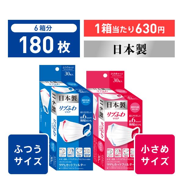 「リブラボ」が「【180枚分】日本製リブふわマスク 耳ひも幅6mm 個包装 30枚 x6箱 ( ふつう or 小さめ ) 【 日本製 マスク 不織布マスク オメガ構造 シングルワイヤー 3層構造 かぜ 花粉 ハウスダスト PM2.5 リブふわ リブ リブラボ リブラボラトリーズ 】」を販売