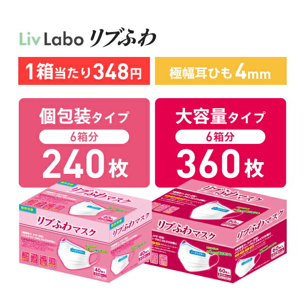 「リブラボ」が「【不織布マスク】リブふわ マスク 耳ひも幅4mm 6箱 ( 360枚分 60枚入 x6箱 大容量 or 240枚分 40枚入 x6箱 個包装 ) 【 オメガ構造 シングルワイヤー 小さめ サイズ 3層構造 かぜ 花粉 ハウスダスト PM2.5 オメガタイプ リブふわ リブ リブラボ リブラボラトリーズ 】」を販売