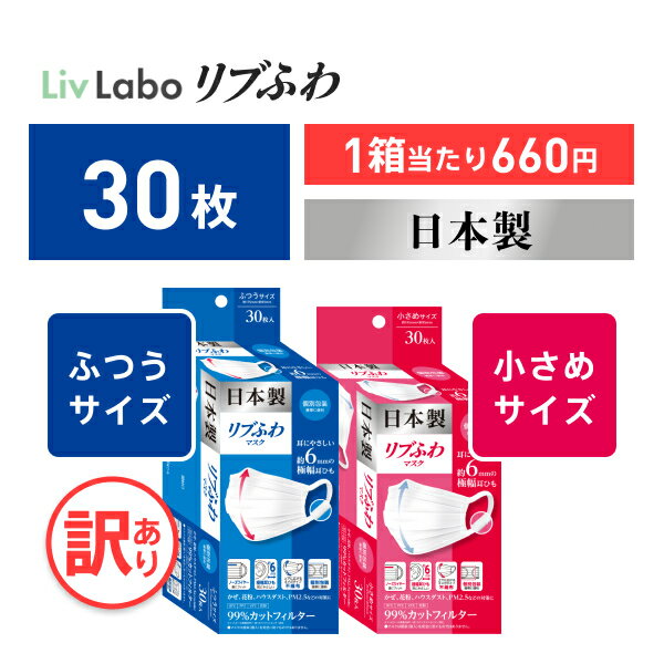 「リブラボ」が「【4/20限定 ポイント2倍!】30枚分 日本製リブふわマスク 耳ひも幅約6mm 個包装 30枚x1箱 (ふつうor小さめ) 日本製 マスク 不織布マスク 訳あり *箱潰れ オメガ構造 花粉 PM2.5 リブふわ リブラボ 4580101205048 4580101204997」を販売