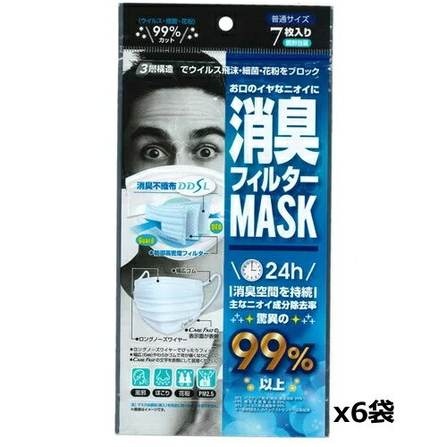 【ゆうパケット配送!送料無料】消臭フィルターマスク(ふつうサイズ)7枚入 x 6個セット(ワンコイン ぽっきり価格)(ポスト投函 追跡ありメール便)