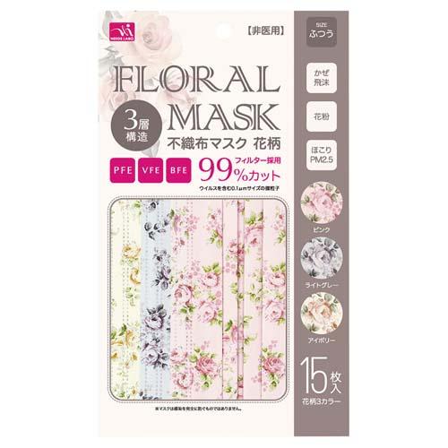 「セレジオーネ(インテリア雑貨)」が「【FLORAL MASK】不織布マスク 花柄 (3色各5枚)15枚入(3層構造 かぜ飛沫 花粉 ほこり PM2.5 99%カット)【メール便対応】」を販売