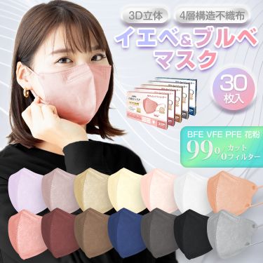 30枚セット 4層立体マスク 個別包装 個性的 カラー紐 カラフル 耳が痛くなりにくい 通勤 通学 子ども 大人 男 女 痛くない フィット ダスト 掃除 外出 出勤 衛生 清潔 蒸れない 3D