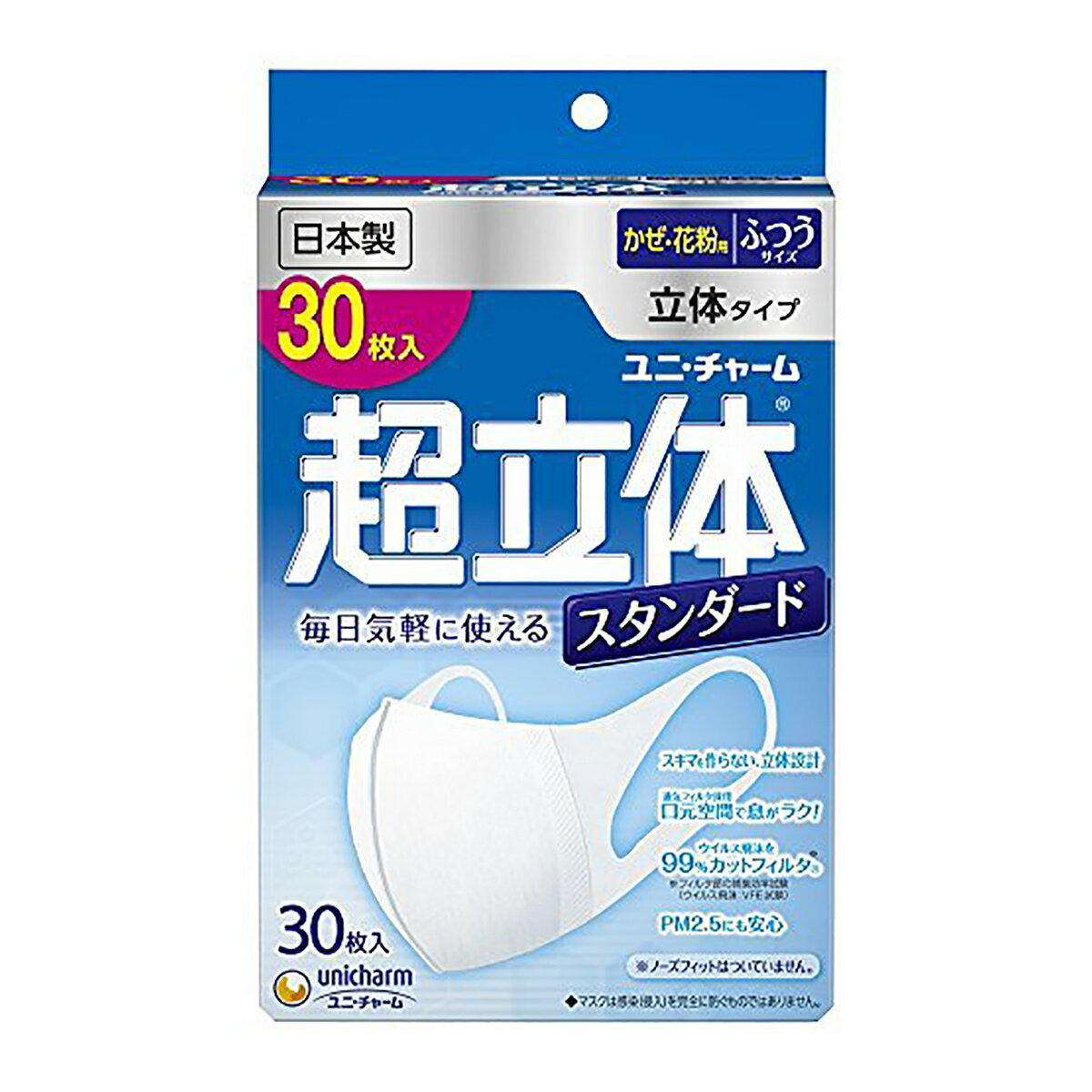 マスク/大人用マスク「スキマを作らず、強力遮断!」毎日使える大容量タイプ三層構造フィルタと全面フィット構造で「スキマを作らず、強力遮断!」三層構造の高密度フィルタでウイルス飛沫・花粉をブロック超立体構造でぴったりフィットやわらかく、幅が広い不織布耳かけで長時間使用しても耳が痛くない息ラクフィルタと口元空間で息ラクラク高い保湿効果でのどをうるおす*ノーズフィットはついていません商品名:ユニ・チャーム *超立体マスクスタンダードふつう30枚 超立体マスク スタンダードふつう 30枚ブランド:チヨウリツタイマスク「スキマを作らず、強力遮断!」毎日使える大容量タイプ JAN:4903111961016販売元: ユニ・チャーム1cs:18「超立体マスク スタンダード ふつう 30枚入」は、三層構造フィルタと全面フィット構造でスキマを作らない立体マスクです。三層構造の高密度フィルタでウイルス飛沫・花粉をブロック。さらに超立体構造でぴったりフィットするので、スキマを作りません。やわらかく、幅が広い不織布耳かけで長時間使用しても耳が痛くなりません。息ラクフィルタと口元空間で呼吸がしやすく、また高い保湿効果でのどをうるおします。※ノーズフィットはついていません。使用方法●マスクの上下を確認してマスクを左右に広げます。●耳かけ部分を引っ張りながら、マスクを耳にかけます。微調整をして顔にピッタリフィットさせます。使用上の注意●個人差により、眼鏡が曇る場合がありますので、運転の際などは十分にご注意ください。●本品は使いきり商品です。洗濯による再使用はできません。●耳かけを引っ張りすぎると、ゆるくなることがあります。●本品は有害な粉塵やガス等の発生する場所でのご使用はできません。●万一、かゆみ・カブレ等の症状があらわれた場合は、直ちにご使用をやめ、医師にご相談ください。●万一、においにより気分が悪くなった場合は、ご使用をおやめください。●乳幼児の手の届かない所に保管してください。●高温多湿な場所での保管は避けてください。●火気のそばでのご使用はおやめください。素材●本体・フィルタ部:ポリオレフィン・ポリエステル●耳ひも部:ポリオレフィン・ポリエステルお問い合わせ先ユニ・チャーム0120-041-062ブランド:超立体マスク衛生医療 > マスク > 機能性マスク > ウイルス対策マスク > 超立体マスク スタンダード ふつう 30枚入発売元 ユニ・チャーム原産国 日本内容量:30枚JANコード: 4903111961016広告文責:アットライフ株式会社TEL 050-3196-1510※商品パッケージは変更の場合あり。メーカー欠品または完売の際、キャンセルをお願いすることがあります。ご了承ください。