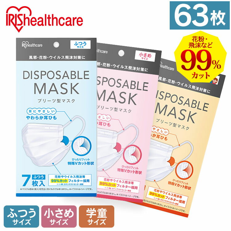 花粉・飛沫等を99%カットするフィルターを採用しています。側面両端Vカット加工しているので、ほほとのすき間を低減し、長時間ぴったりフィットします。耳にやさしいやわらか丸耳ひも採用で耳が痛くなりにくいです。(耳ひも:丸ひも4mm)ダブルΩプリーツ加工で口元空間をキープするから会話が楽です。 <学童サイズ> ●内容量 7枚×9袋【63枚入り】 ●商品サイズ(cm) 幅約13.5×高さ約8 ●主要材質 本体・フィルター:ポリプロピレン 耳ひも:ポリウレタン、ポリエステル ノーズフィッター:ポリエチレン <小さめサイズ> ●内容量 7枚×9袋【63枚入り】 ●商品サイズ(cm) 幅約14.5×高さ約9 ●主要材質 本体・フィルター:ポリプロピレン 耳ひも:ポリウレタン、ポリエステル ノーズフィッター:ポリエチレン <ふつうサイズ> ●内容量 7枚×9袋【63枚入り】 ●商品サイズ(cm) 幅約16.5×高さ約9 ●主要材質 本体・フィルター:ポリプロピレン 耳ひも:ポリウレタン、ポリエステル ノーズフィッター:ポリエチレン ※現在、お届け日のご指定はお受付出来かねております ※配送先住所・カラー・数量などの入力間違いが増えています。ご注文後の注文内容変更はお受付致しかねます。再度ご確認ください。★ご注文前のよくある質問についてご確認下さい★