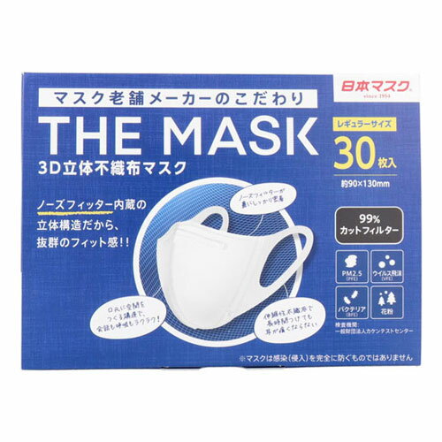 ————————————————————– 画像はイメージです。 ※ PC環境により実際の色味や質感と異なって表示される場合がございます。 ※ 部品・パーツなどの一部の商品では本体の商品画像を使用しております。 ※ 製品の仕様・画像・パッケージは、メーカー側から予告なく変更される場合があります。 ————————————————————– フィット感を追求した、こだわり3D立体マスク!●フィット感を追求した、こだわり3D立体マスク!●ノーズフィッター内蔵の立体構造だから抜群のフィット感!●顔の輪郭をスッキリみせるデザインのシャープライン。●隙間ができやすかった鼻部分はノーズフィッターを採用したことでしっかり密着。●口元に空間をつくる構造で会話も呼吸もしやすい。●耳かけに伸縮不織布を採用し、長時間の使用でも快適。●30枚入りの大容量タイプ。●99%カットフィルタを内蔵。PFE(微粒子濾過効率):99%VFE(ウィルス飛沫濾過効率):99%BFE(バクテリア濾過効率):99%花粉捕集効率:99%※検査機関:一般財団法人 カケンテストセンターにて検査済※マスクは感染(侵入)を完全に防ぐものではありません。【対象】風邪・花粉・ほこり・PM2.5等【仕様】サイズ:約H90mm×W130mm内容量:30枚材質・成分:本体・フィルター部:ポリプロピレン耳ひも部:ポリプロピレン・ポリスチレン・ポリエチレンノーズフィッター:ポリエチレン生産国:フィリピン【注意】・メーカーの都合により、パッケージ/仕様等は予告なく変更になる場合がございます。・乳幼児や呼吸器に異常がある方は使用しないでください。・万一、かゆみ、かぶれ等の症状があらわれた場合は、直ちに使用を中止してください。・肌に異常がある場合は、悪化することがありますので、ご使用は避けてください。・本品は有毒ガス、有害粉塵などに対して、効果はありません。・本品は使い切り製品の為、洗濯はできません。・乳幼児の手の届かないところに保管してください。・高温多湿な場所、直射日光の当たる場所での保管は避けてください。・本商品は構造上、正しい装着でも漏れや隙間が生じます。・火気のそばで使用しないでください。 【メーカー・ブランド】 日本マスク 【#150】